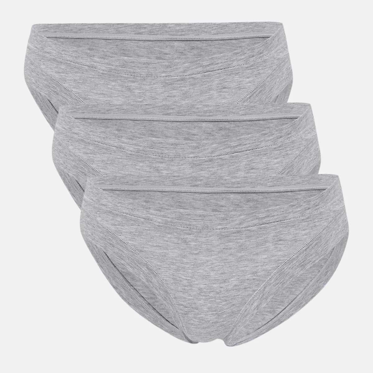 3 par supermjuka, ljusgrå bambu tai trosor. Midjebandet i midjan och kanten vid benutskärningarna är sydda med platta sömmar. Bambu är absorberande och andas, vilket gör den perfekt för underkläder.
