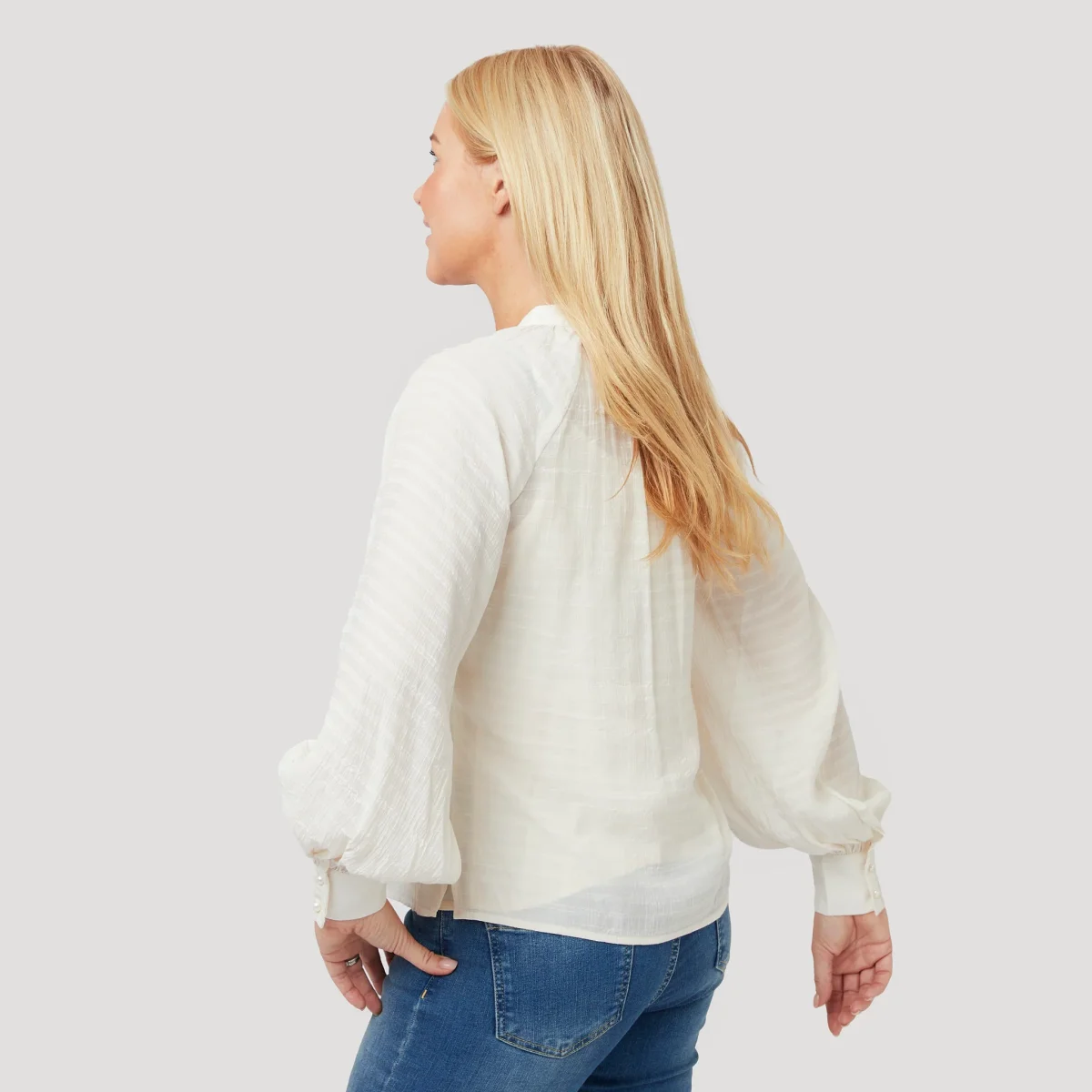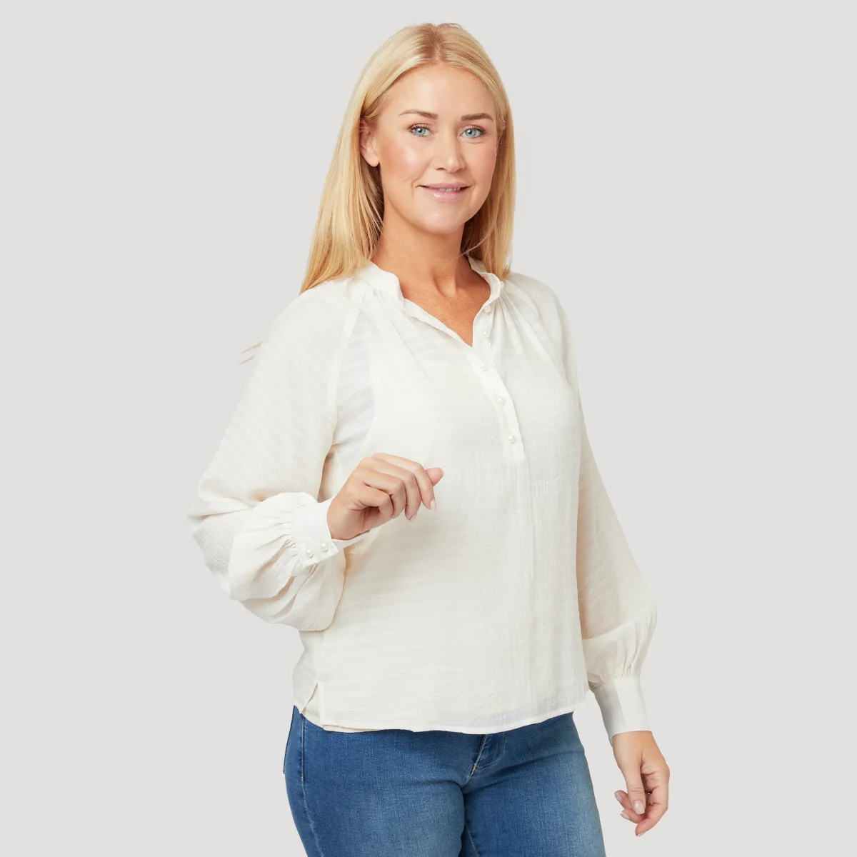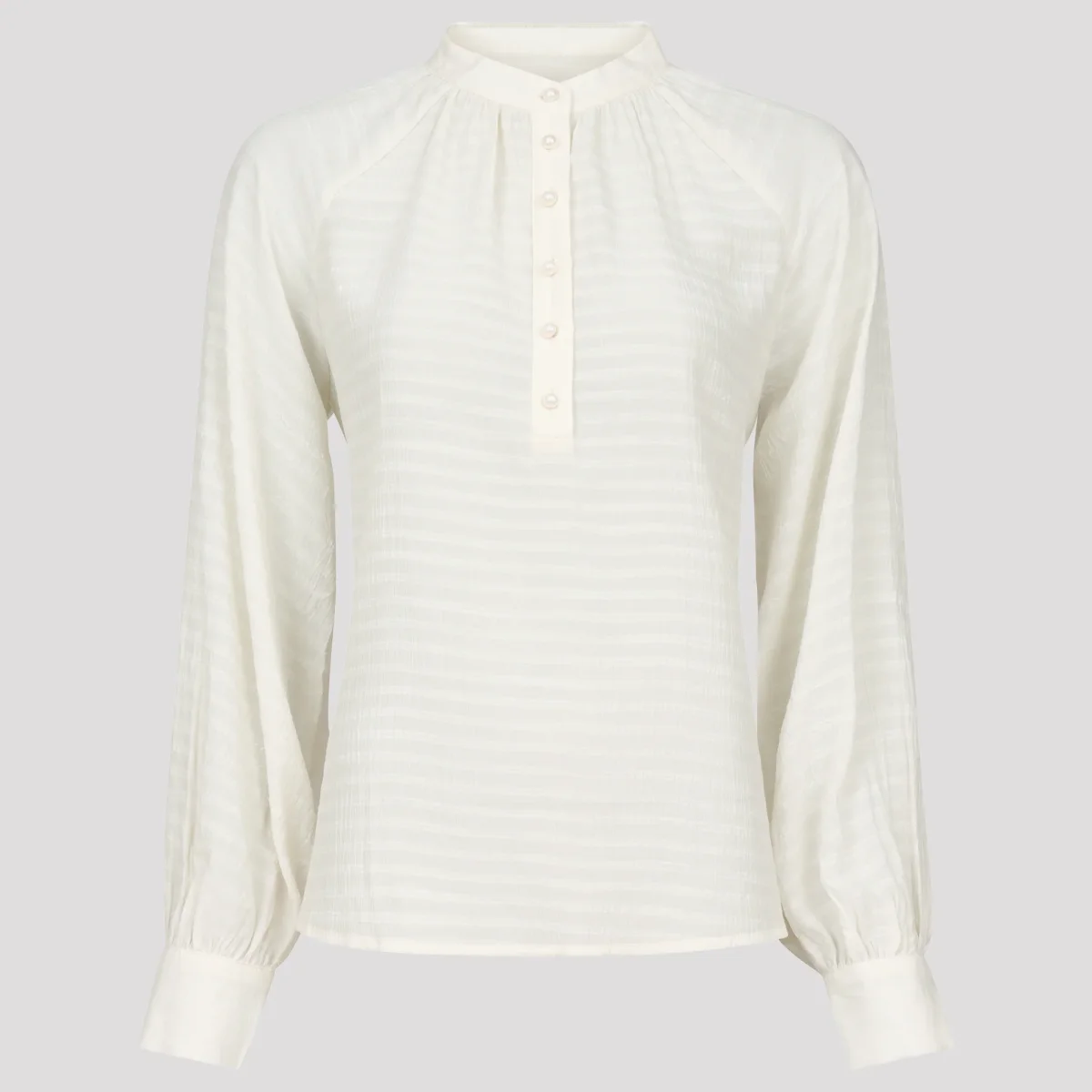 Vit, skir blus med struktur och pärlknappar. Den krämvita blusen har en liten ståkrage med rynk runt om, en halv knappslå fram och lång ärm med rynk och manschett med knappar. Blusen kommer med ett löst linne då den är något transparent. Vår modell Marianne är 173 cm och har storlek S på sig.