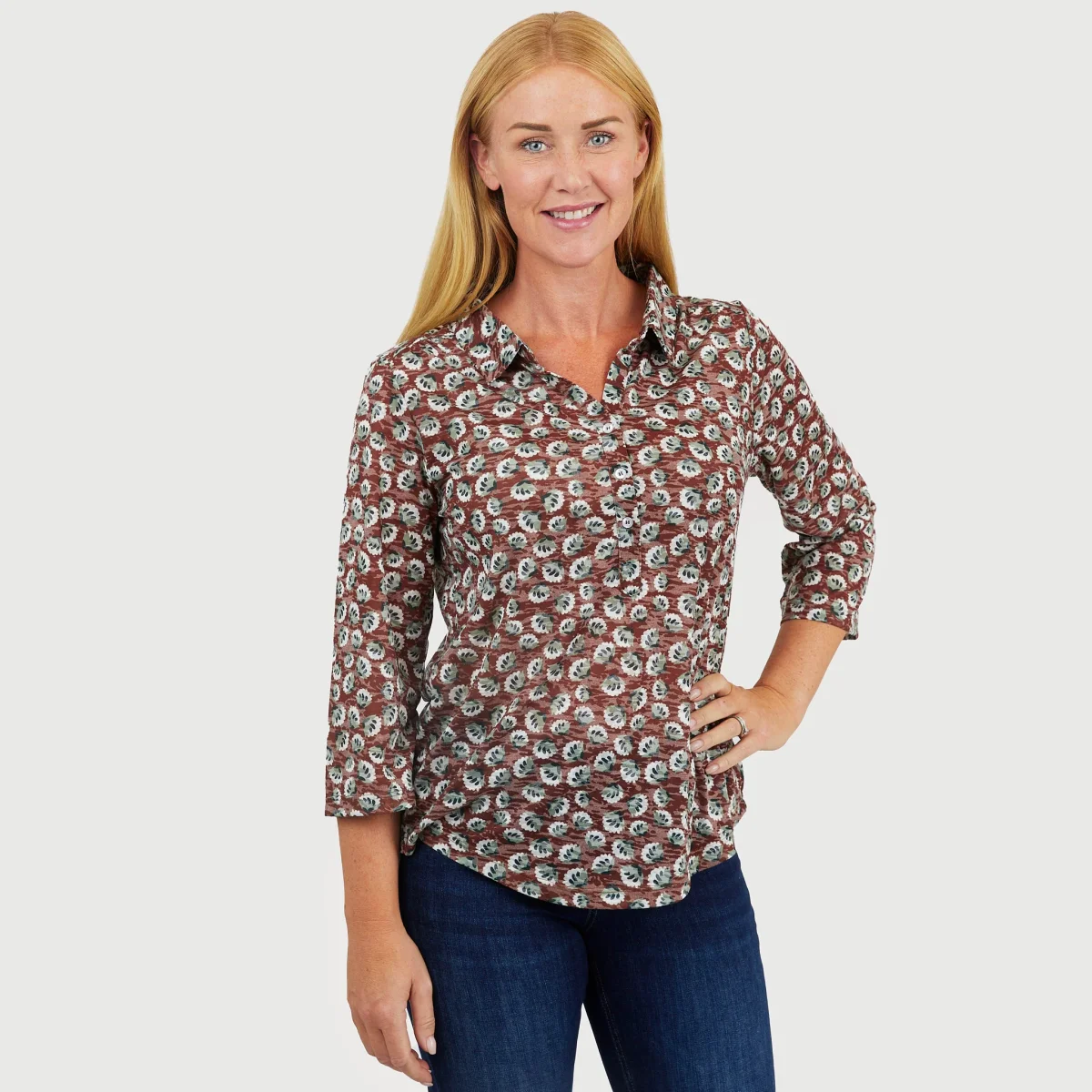 En något transparent, naturinspirerad topp med rostbrun bas. Den snygga toppen har en trekvartsärm och halv knappslå fram. Toppen liknar våra tidigare modeller Ammy och Annie. Vår modell Marianne är 173 cm och har storlek M på sig.