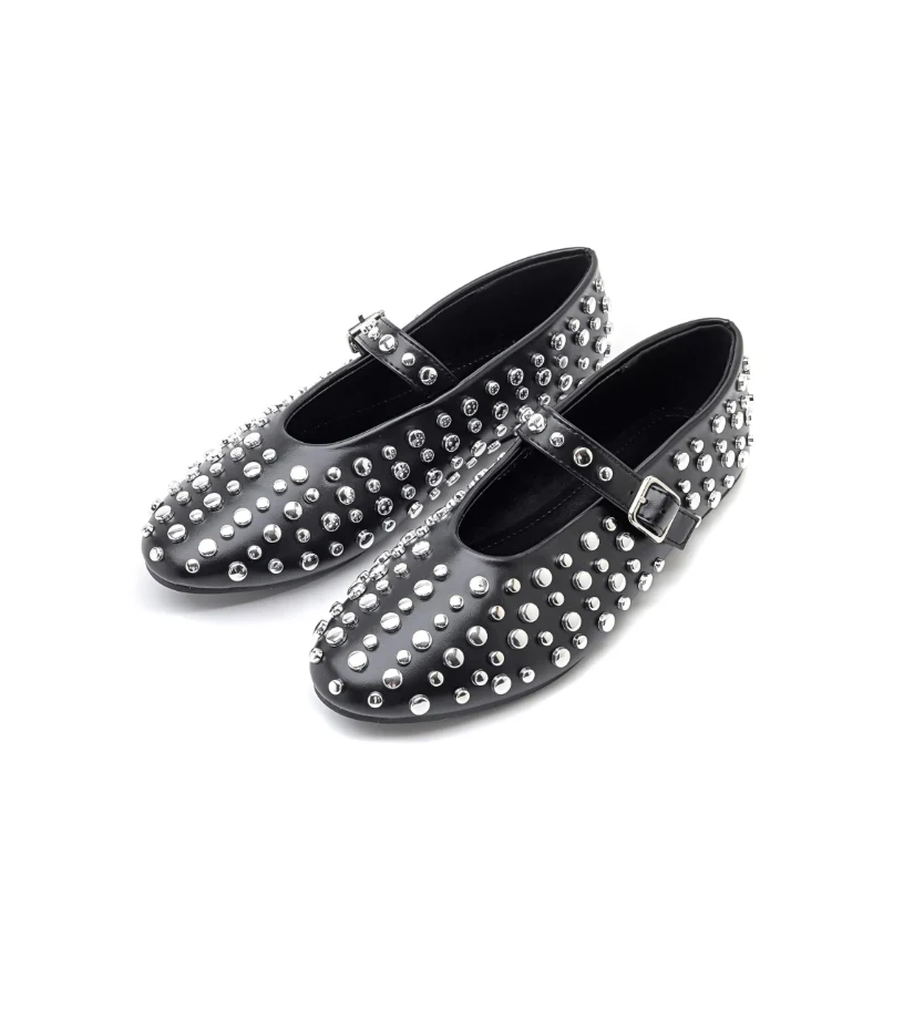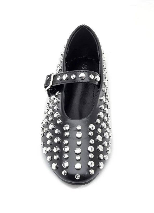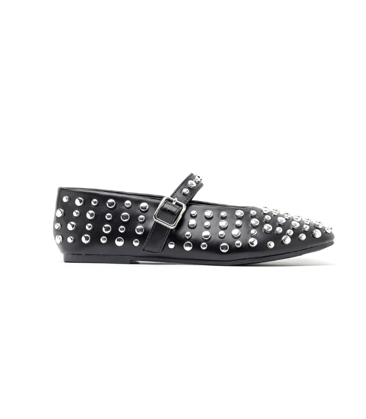 Ge din look en edgy men elegant touch med dessa trendiga ballerinas i Mary Jane-modell. Skorna är tillverkade i eco-läder och dekorerade med glansiga nitar som ger ett modernt och uttrycksfullt intryck. Den justerbara remmen med metallspänne ger både en snygg detalj och en bekväm passform, medan den platta sulan gör dem perfekta för heldagsbruk. Lika fina till jeans som till klänning – ett statement-plagg i garderoben.