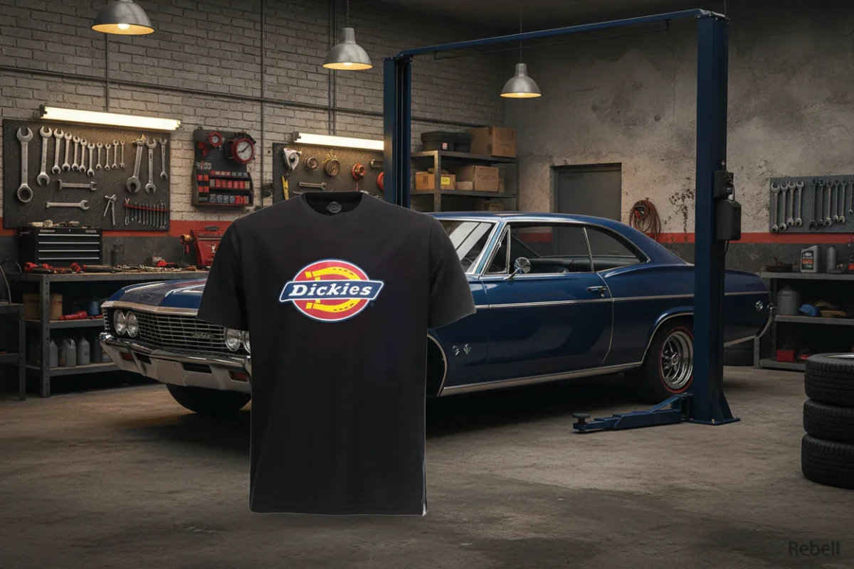 Med stor dickies logga över bröstet.
