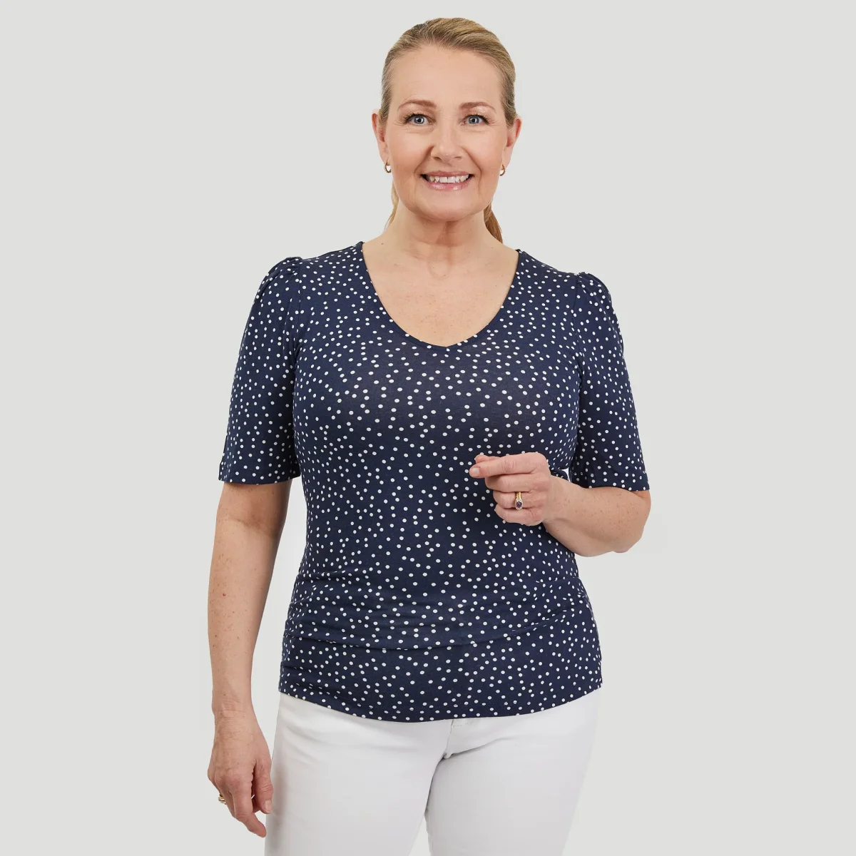Marinblå topp med vita prickar. Den snygga toppen har en tight passform. En v-ringad och skön trikåtopp som inte skrynklar. En enkel vardagstopp som känns lite festlig tack vare den fina puffärmen. Topp från Rosebud. Vår modell Yvonne är 170 cm och har storlek S på sig.