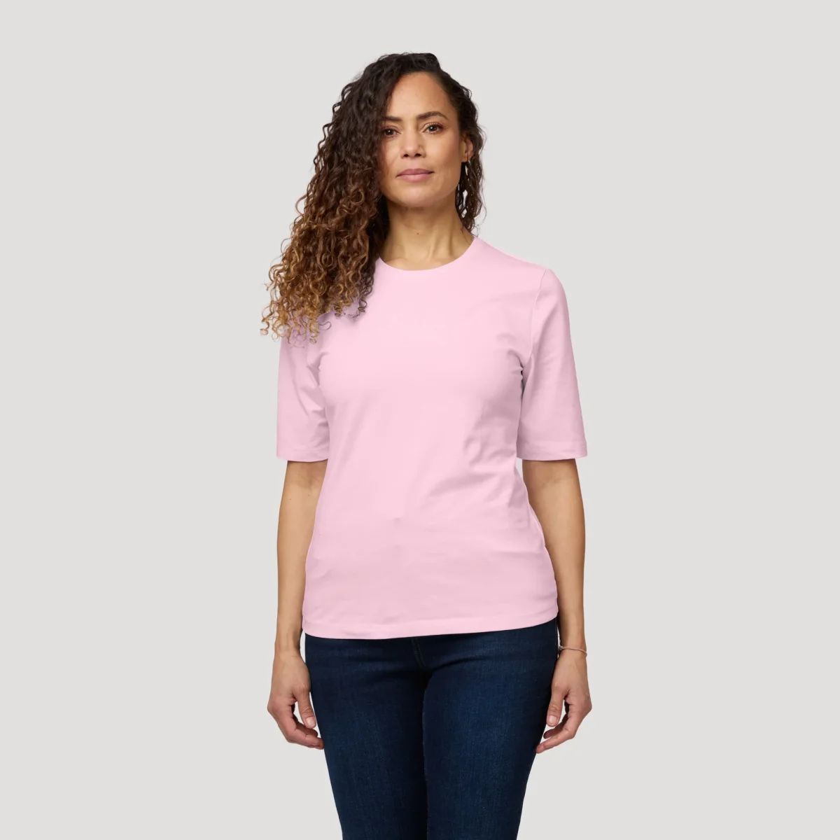 Klassisk t-shirt i rosa bomull med rund hals. Ett perfekt basplagg med nätt passform och ärm ner till armbågen i en ljusrosa nyans. Vår modell Charlene är 170cm och har storlek S på sig.