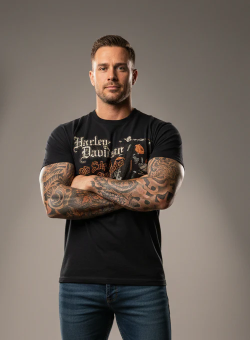 T-shirten fungerar utmärkt tillsammans med jeans, boots eller skinnjacka och ger en avslappnad men kraftfull look. Materialet är bekvämt nog för heldagsbruk men samtidigt robust nog för en aktiv livsstil.