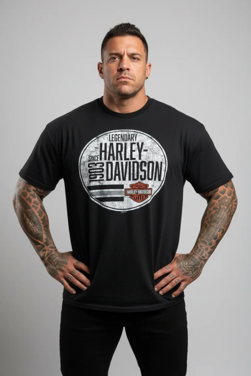 T-shirten passar både herr och dam och är lätt att matcha med jeans, skinnjacka eller hoodie för en komplett biker-look. Materialet är mjukt, slitstarkt och bekvämt för både vardag och motorträffar. Den ikoniska Harley‑Davidson‑inspirerade designen gör den till ett statement-plagg som sticker ut i varje outfit.