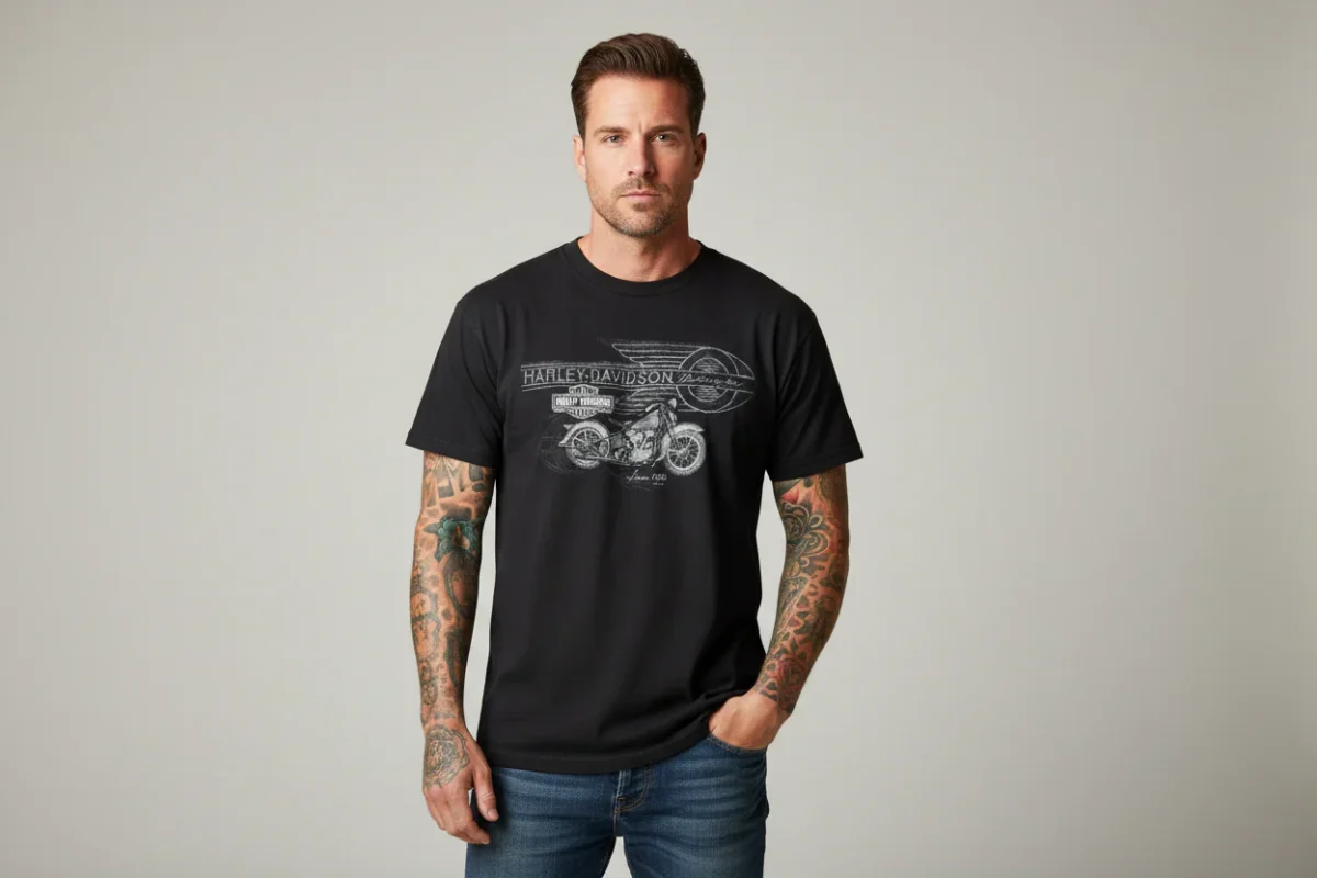 T-shirten passar både herr och dam och är lätt att matcha med jeans, skinnjacka eller hoodie för en komplett biker-look. Materialet är mjukt, slitstarkt och bekvämt för både vardag och motorträffar. Den ikoniska Harley‑Davidson‑inspirerade designen gör den till ett statement-plagg som sticker ut i varje outfit.