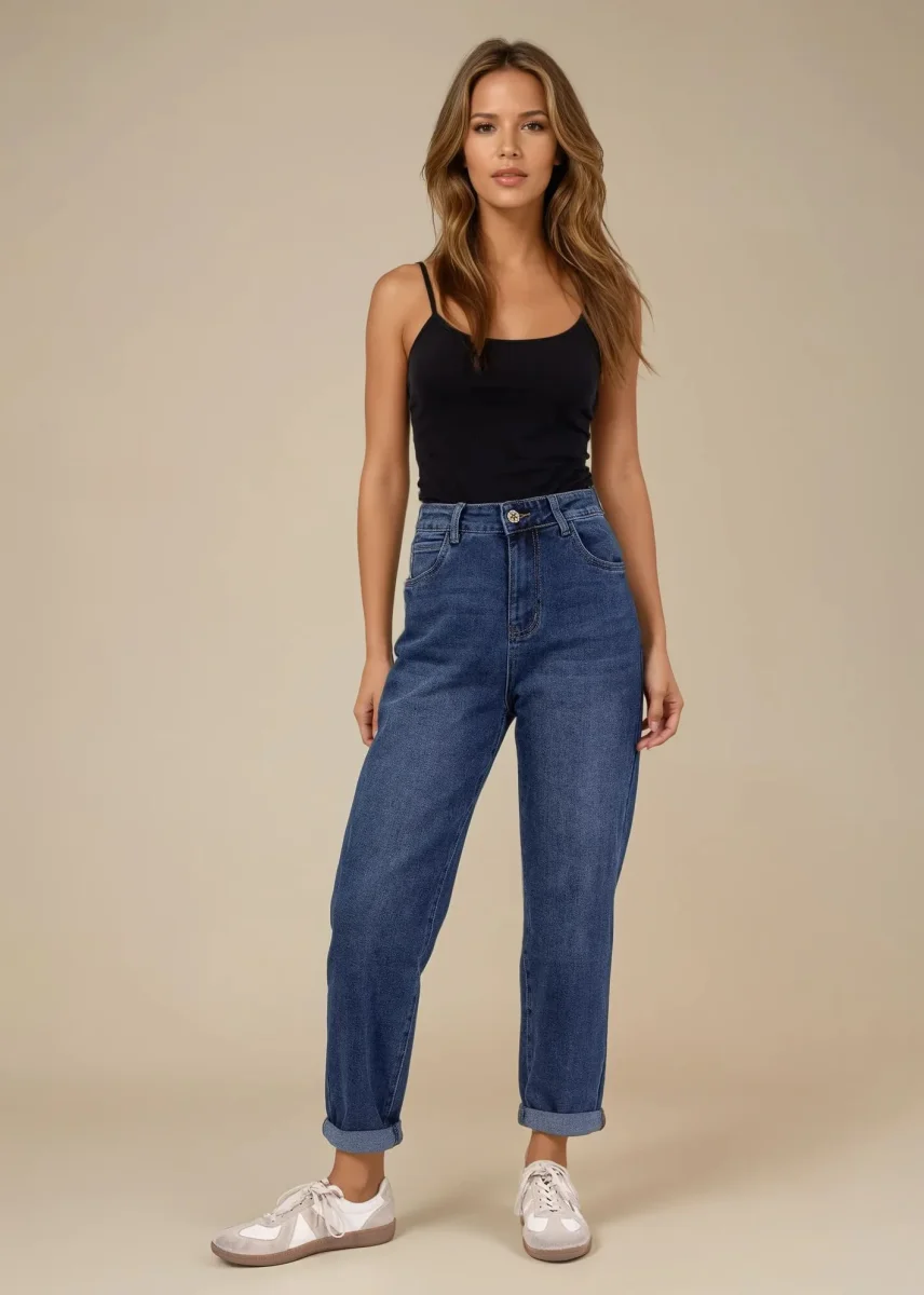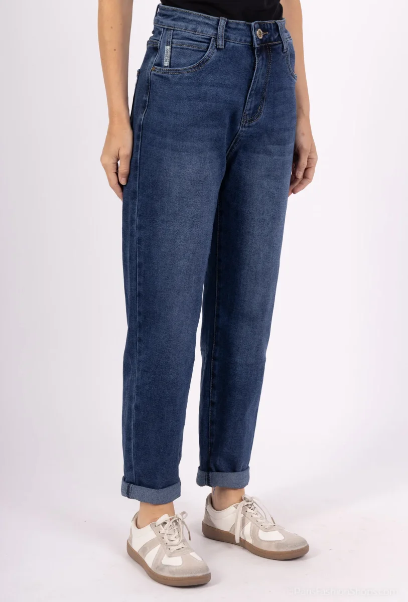 Trendiga och bekväma momfit-jeans i klassisk blå tvätt från det franska märket Karostar. Jeansen har en hög midja och en rak, avslappnad passform som ger både komfort och en stilren look. Det mjuka materialet med stretch gör dem sköna att bära hela dagen, samtidigt som de håller formen.