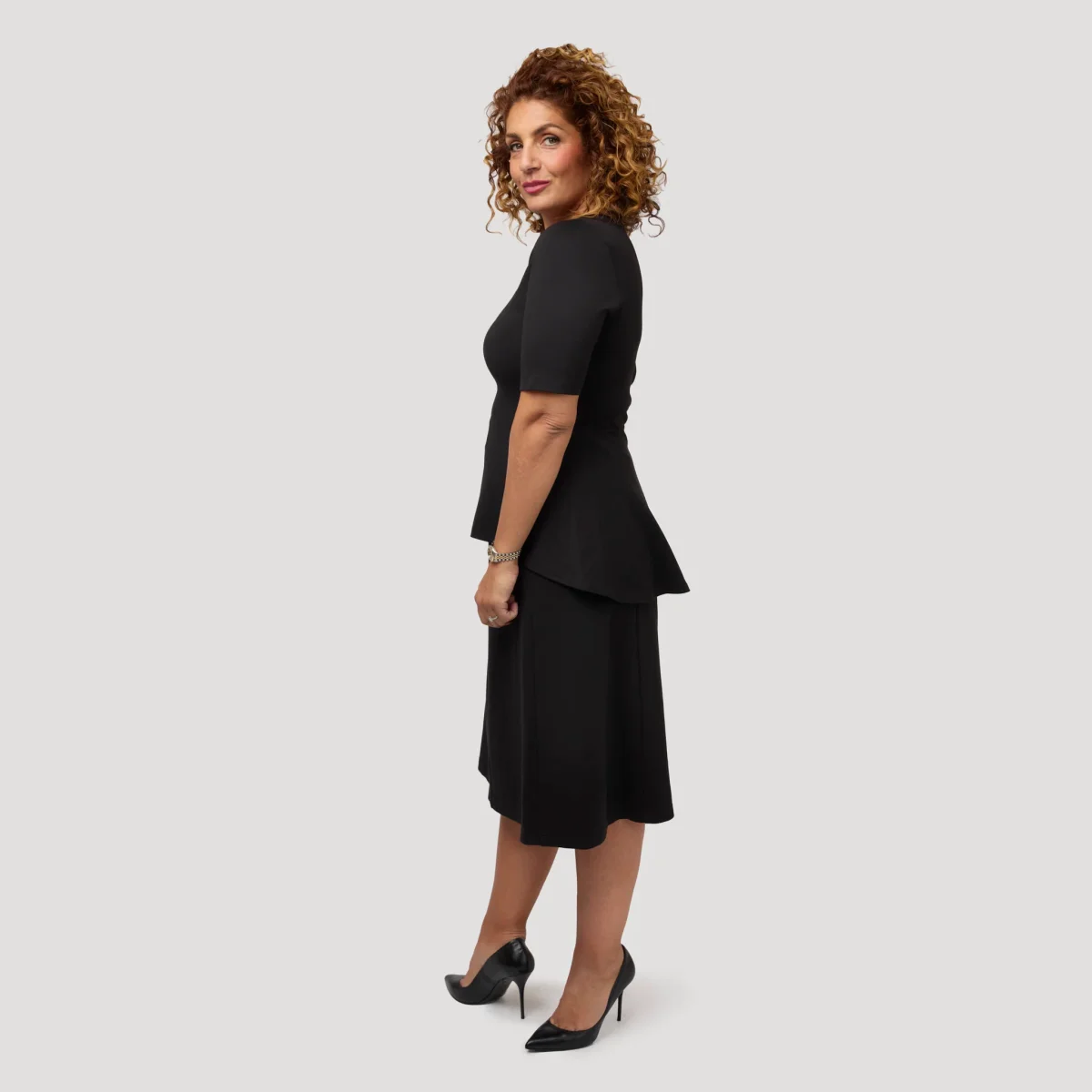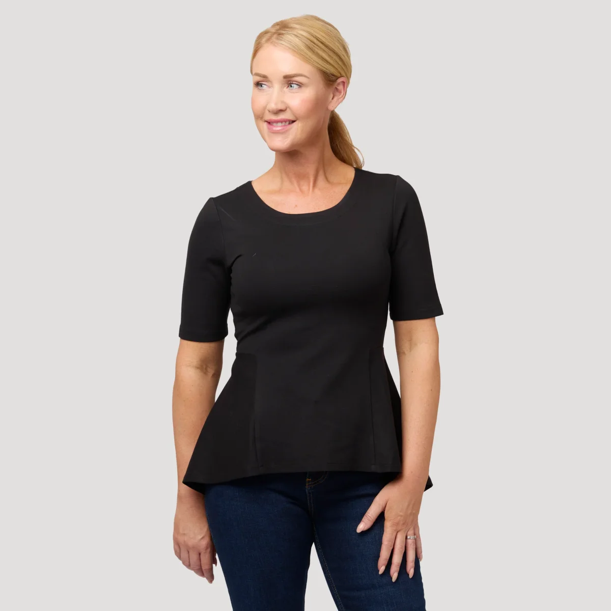 Peplumtopp i svart, stadig trikå med skön stretch och rund hals. Topp med avskärning i midjan med vidd nertill som är längre bak än fram. Toppen har ärm till armbågen. Toppen är nätt i passformen upptill så tvekar du mellan två storlekar så bör du välja den större. Vår modell Marianne är 173 cm och har storlek S på sig.