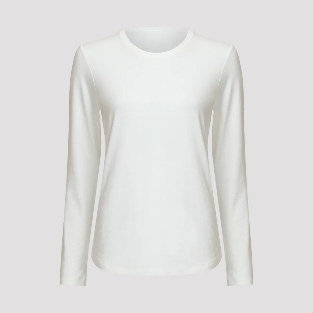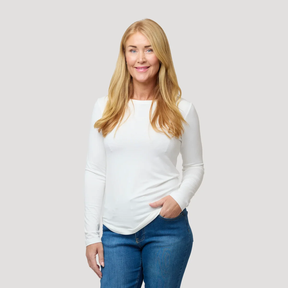 Offwhite topp med rund halsi viskos som är rundad nertill. Långärmad t-shirt som är lite längre bak än fram. Toppen är i samma material som vår populära Jolie topp. Vår modell Marianne är 173 cm och har storlek S på sig.