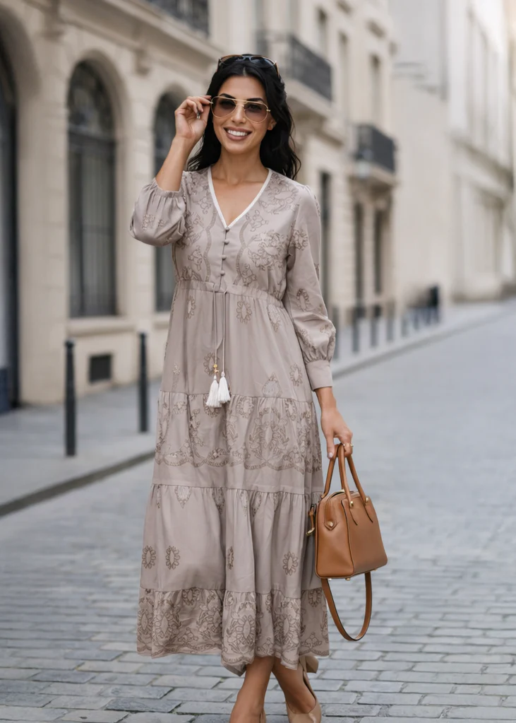 En elegant långklänning i boho-chic stil med vackra broderade detaljer som ger ett sofistikerat och feminint uttryck. Den luftiga och följsamma modellen skapar en smickrande silhuett samtidigt som den erbjuder hög komfort – perfekt för både vardag och mer uppklädda tillfällen.