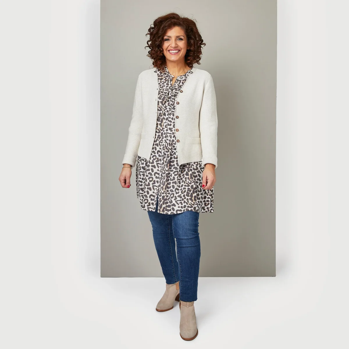Volangtunika med små veck i ståkragen, volanger i krage och bröst och en bred volang nertill. Den leopardmönstrade tunikan har resår vid ärmslut. Tunika från Rosebud. Vår modell Yvonne är 170 cm och har storlek M på sig.
