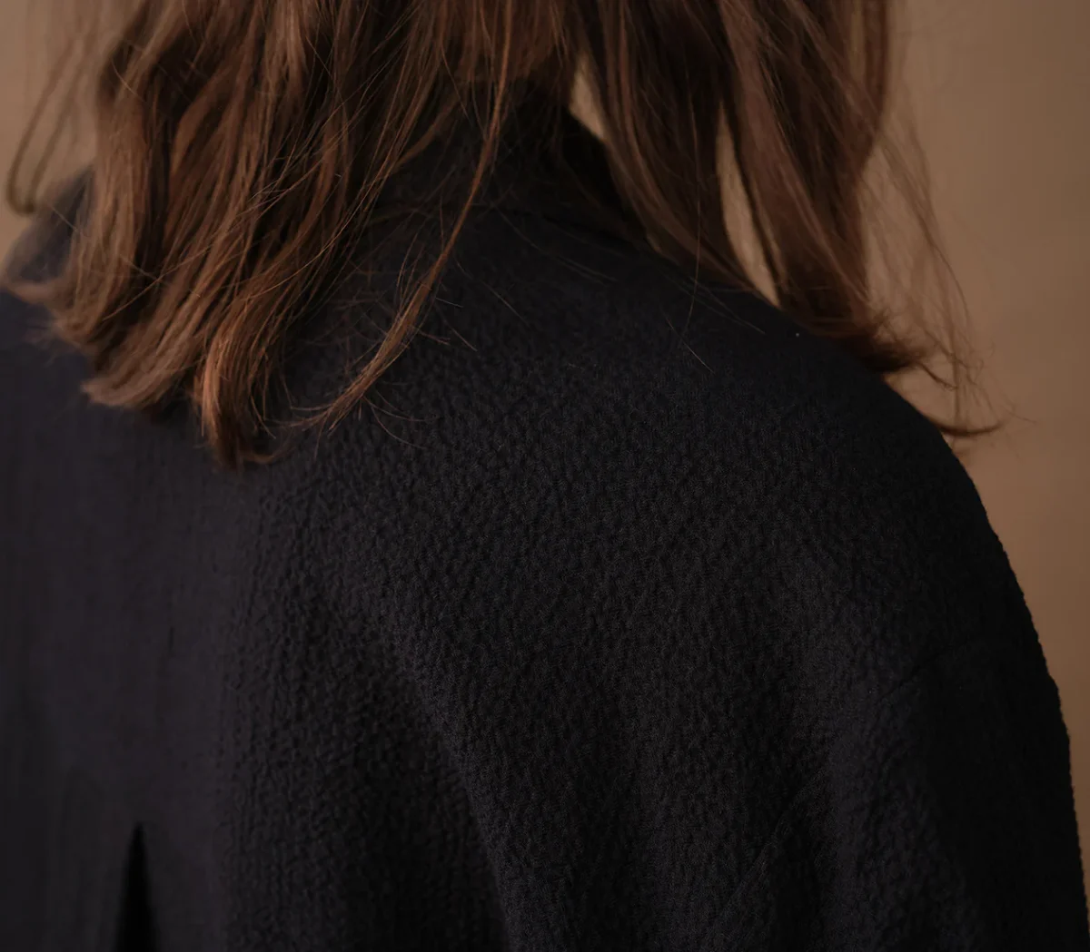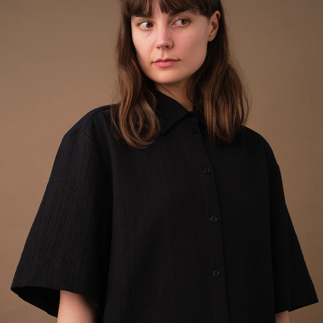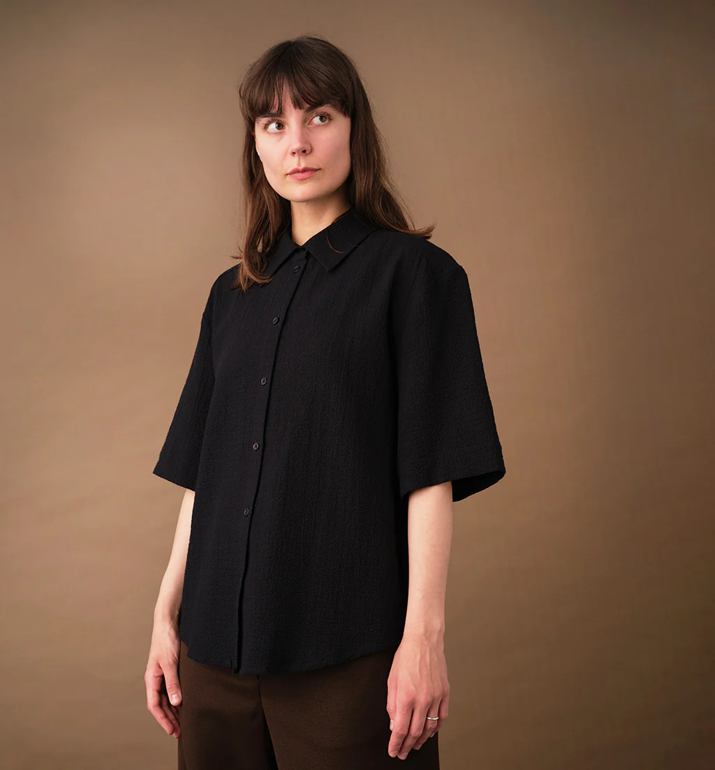 Vår skjorta Unni. Unni är en vid skjorta med armbågslång ärm. Ok med veck i ryggen. Lätt rundad bak. Sydd i ett bomullstyg med lite struktur.