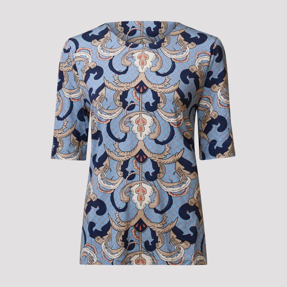 Skön, smickrande topp i viskos med ett fint mönster i blått och beige med inslag av rost. Mönstrad trikåtopp med en rund hals med en bredare halskant. Toppen har en längre t-shirt ärm med liten puff upptill och en slits baktill. Vår modell Marianne är 173 cm och har storlek S på sig.