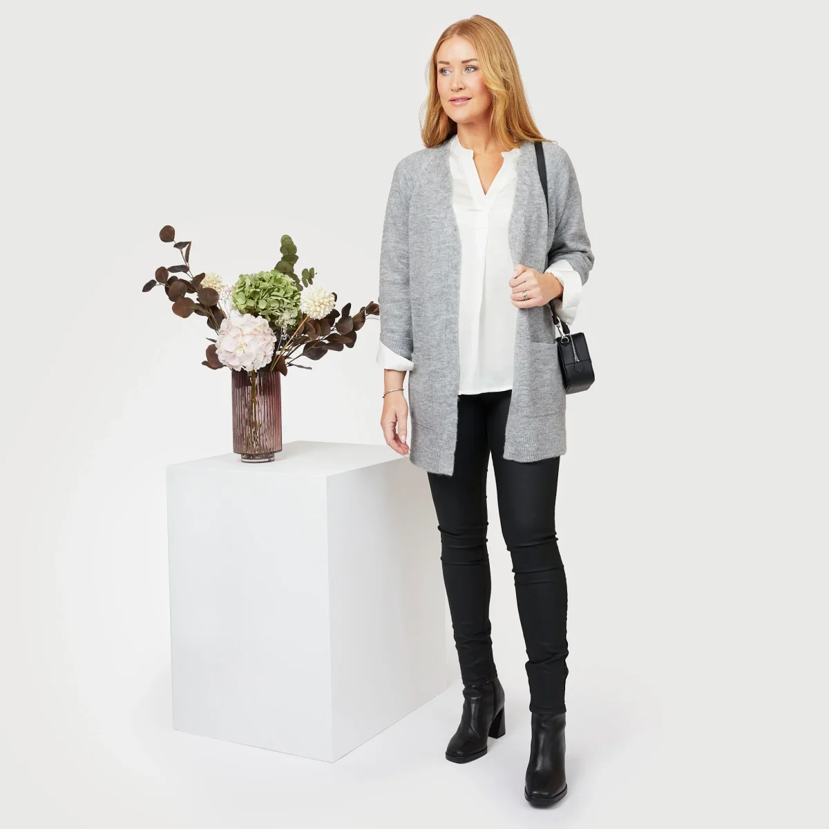 En glansig v-ringad vit blus i offwhite, mjuk modal. Sömmen vid urringningen gör att blusen går något omlott framtill. Den sköna festblusen är något transparent samt rundad och lite längre baktill. Blus från Alice Bizous. Vår modell Yvonne är 170 cm och har storlek M på sig.