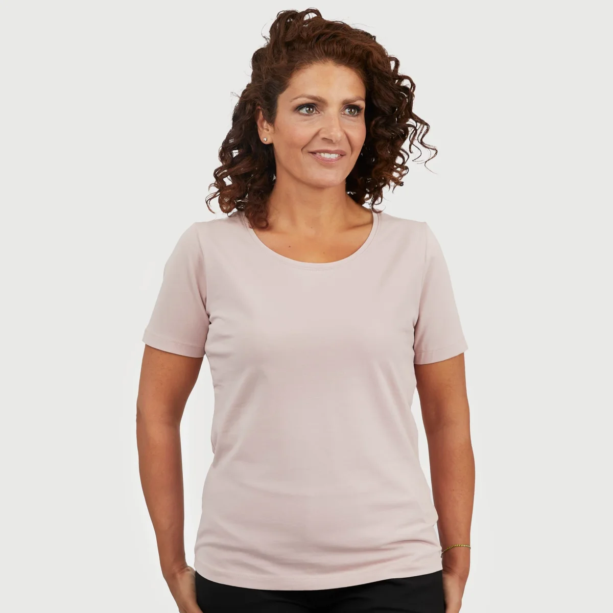 Gammelrosa klassisk bastopp med rund hals i skön bomull med elastan. Denna stilrena topp är stretchiga och kortärmade. Perfekt basplagg som är snygg som den är eller under en kofta eller poncho. Yasmine har storlek M för en lite lösare passform; för en mer kroppsnära passform skulle hon ha haft storlek S. Toppen är från JOY Essential Items.