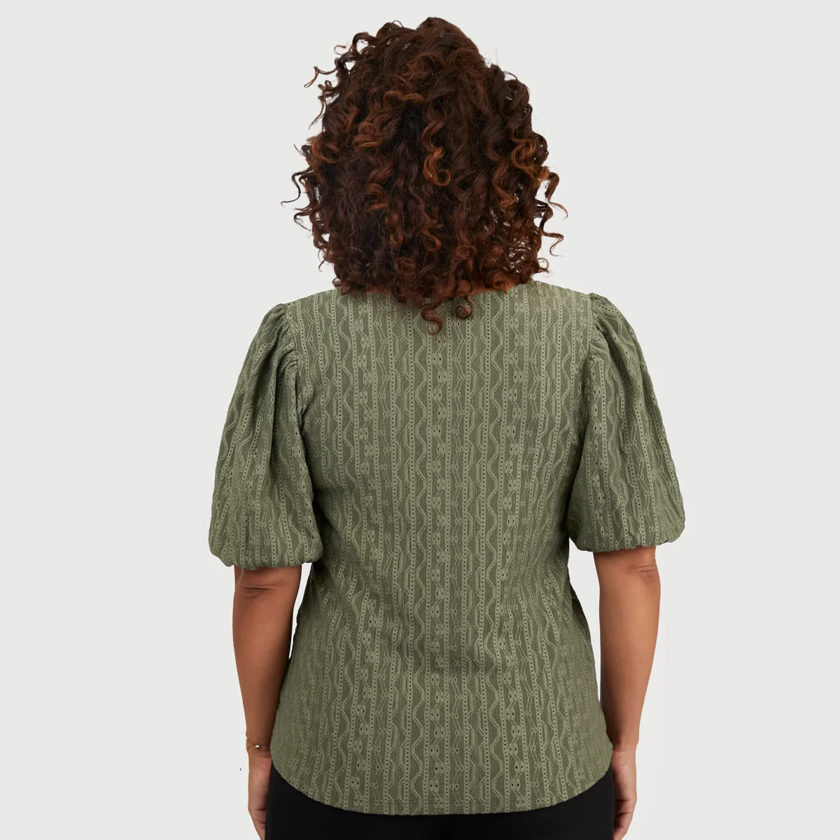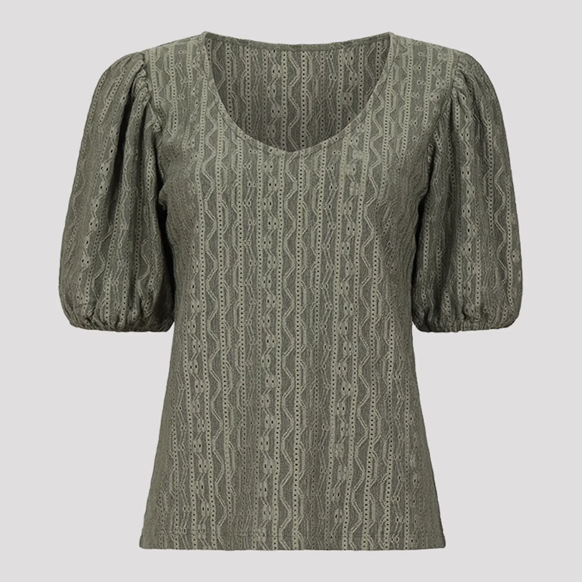 Grön v-ringad topp i spetsmönster i militärgrön ton. Den snygga toppen har puffärm med resår nertill. Toppen passar perfekt både till jeans och som festtopp. Topp från Rosebud. Vår modell Yasmine är 163 cm och har storlek S på sig.