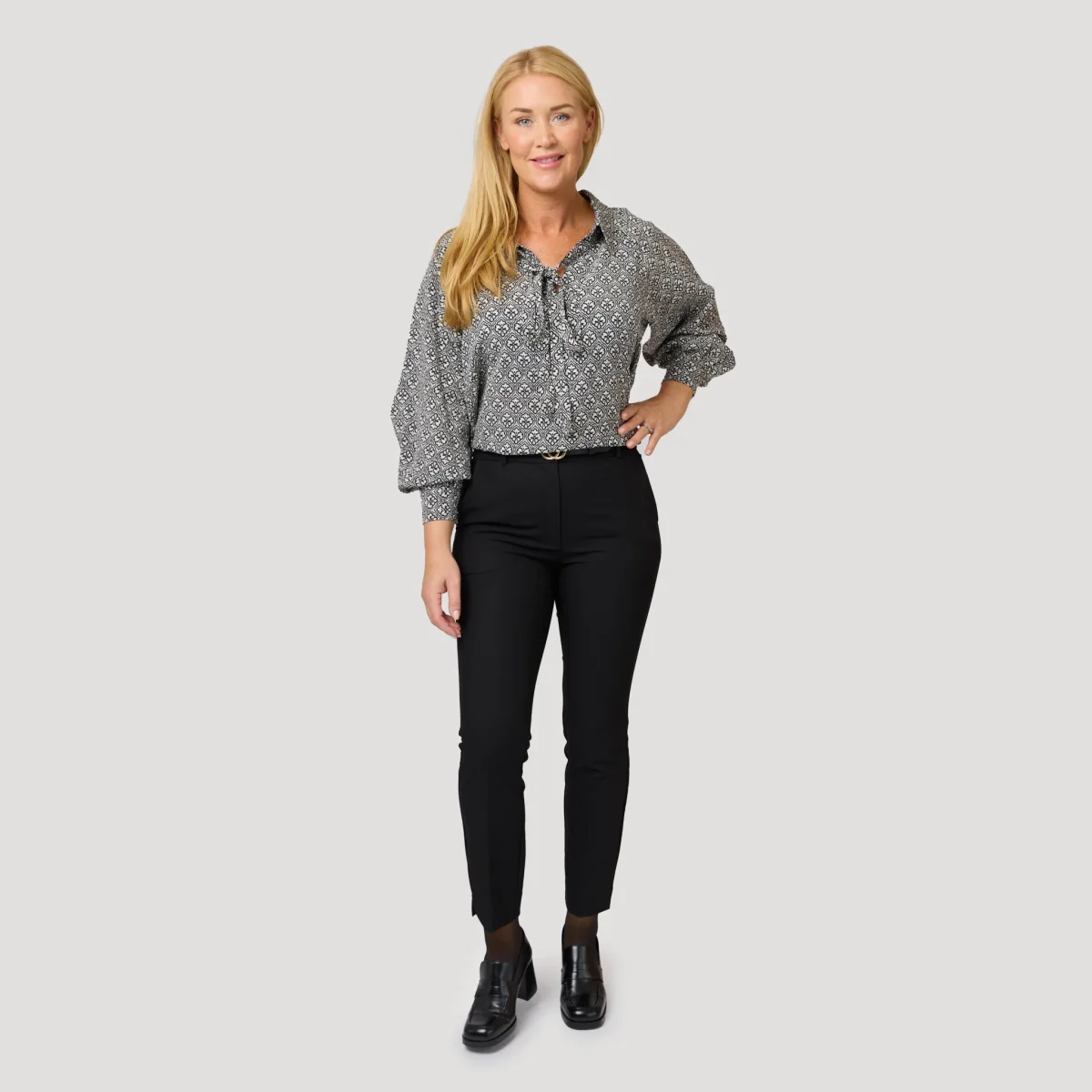 Grå och beigemönstrad blus i vid modell med krage och öppning fram. Blusen har en vid ärm med manschett och är längre fram än bak. Blusen har även ett avtagbart knytband som är fäst med knapp under kragen baktill. Blusen är stor i storleken så gå gärna ner en storlek. Vår modell Yvonne är 170cm och har storlek S på sig. Blus från Alice Bizous.