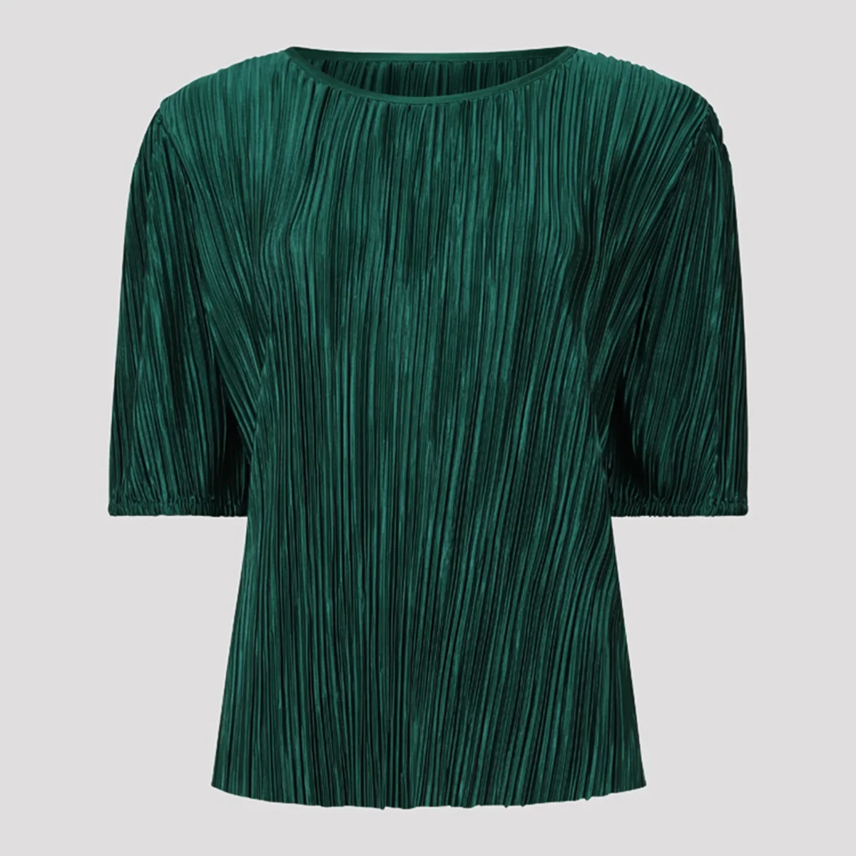 Rundhalsad plisserad topp i grönt med rå kant nertill. Den glansiga toppen har halvlånga puffärmar och resår i ärmslut. Så fin med de matchande byxorna! Topp från Alice Bizous. Vår modell Yasmine är 163 cm och har storlek S på sig.