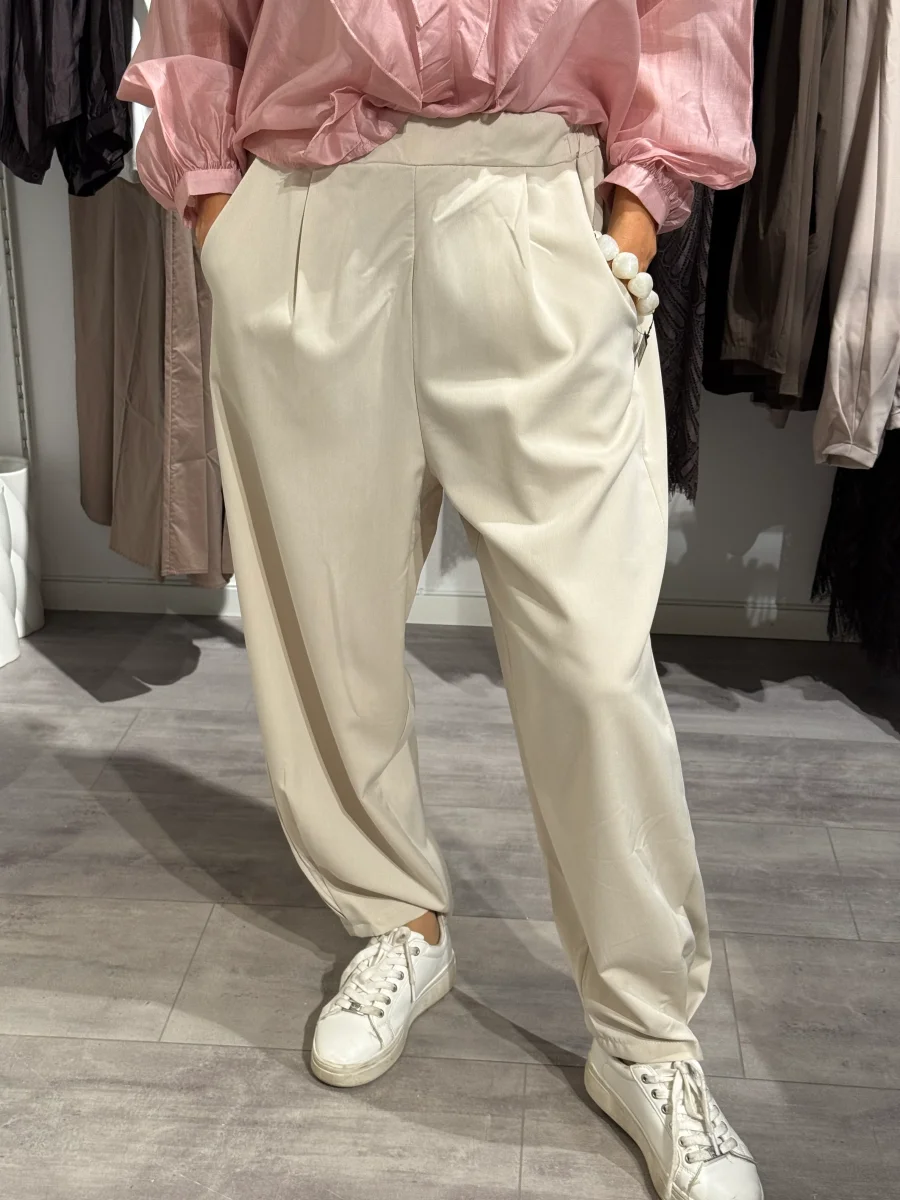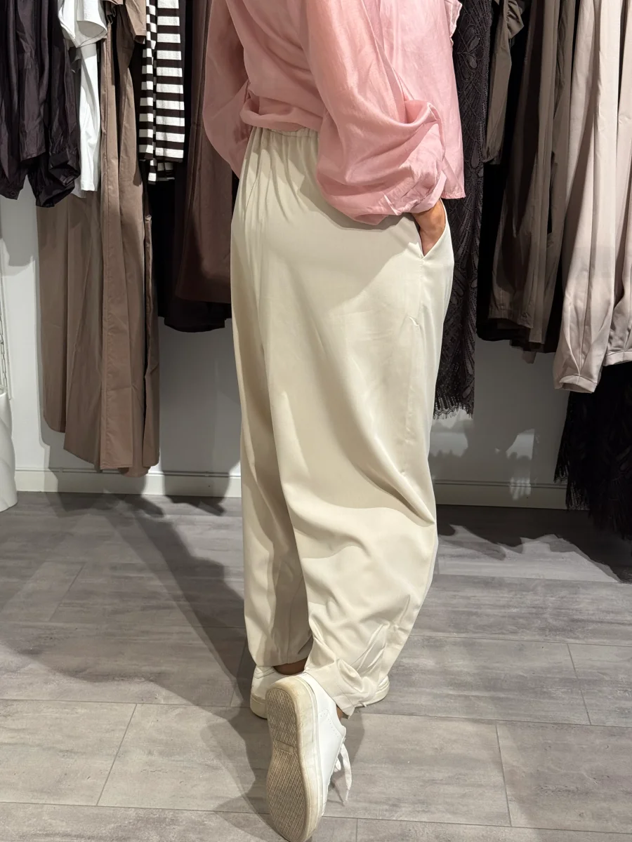 Byxorna har breda ben och en lös passform med elastisk midja.