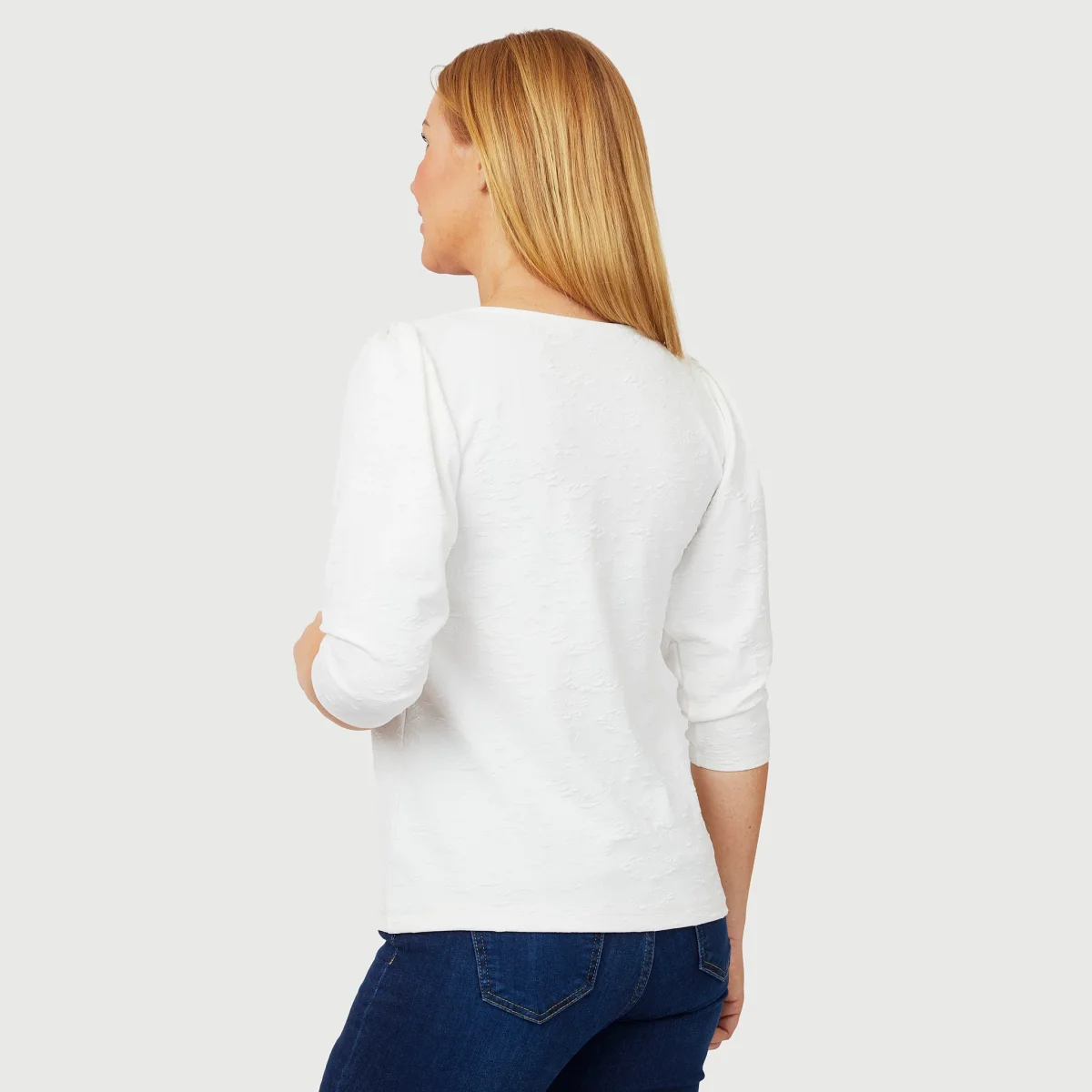 En rundhalsad offwhite tröja i jaquard-mönstrad lite kraftigare trikå. Den sköna tröjan har puffärm som är 3/4 lång. Topp från Rosebud. Vår modell Marianne är 173 cm och har storlek S på sig.