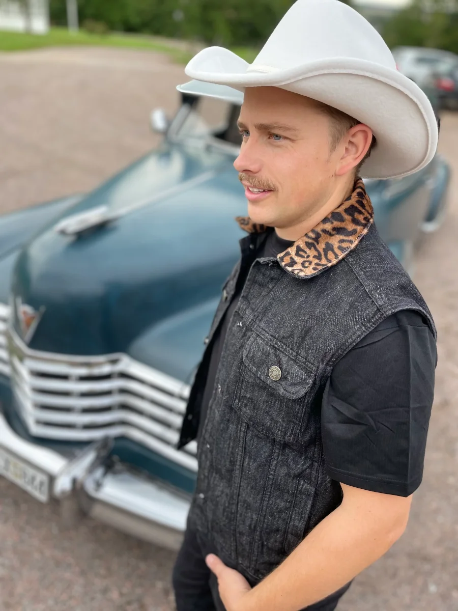Alla behöver en jeansväst en riktigt jeansväst med leopard detaljer i pälsigt snyggt tyg.