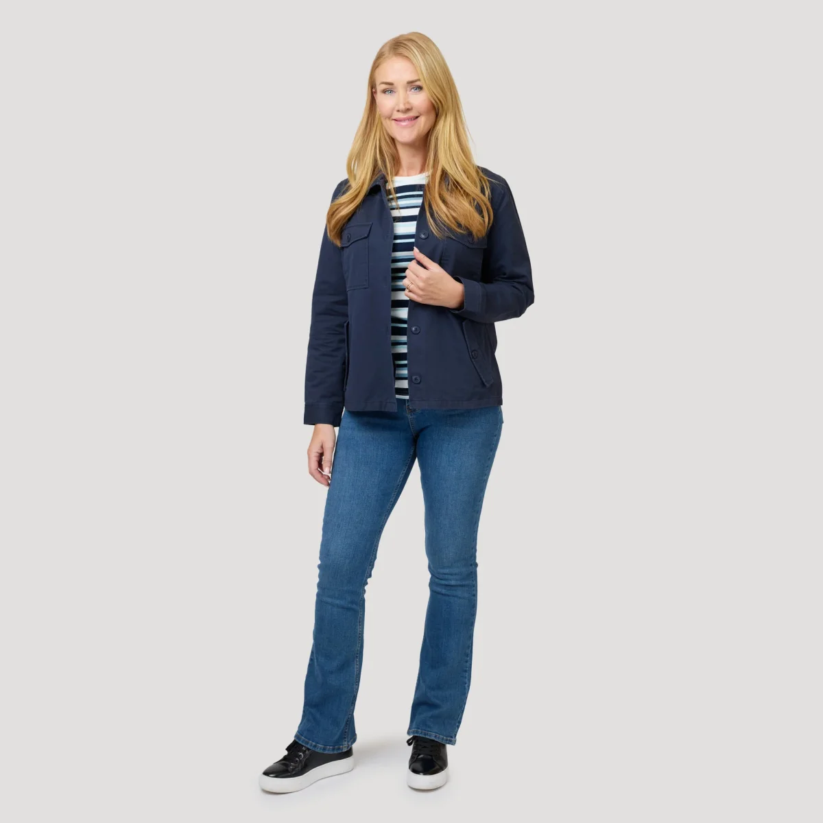 Randig topp i bomull med rund hals. En topp med härliga turkosa och blå toner. Toppen har trefjärdedels ärm. Vår modell Yvonne är 170 cm och har storlek M på sig.