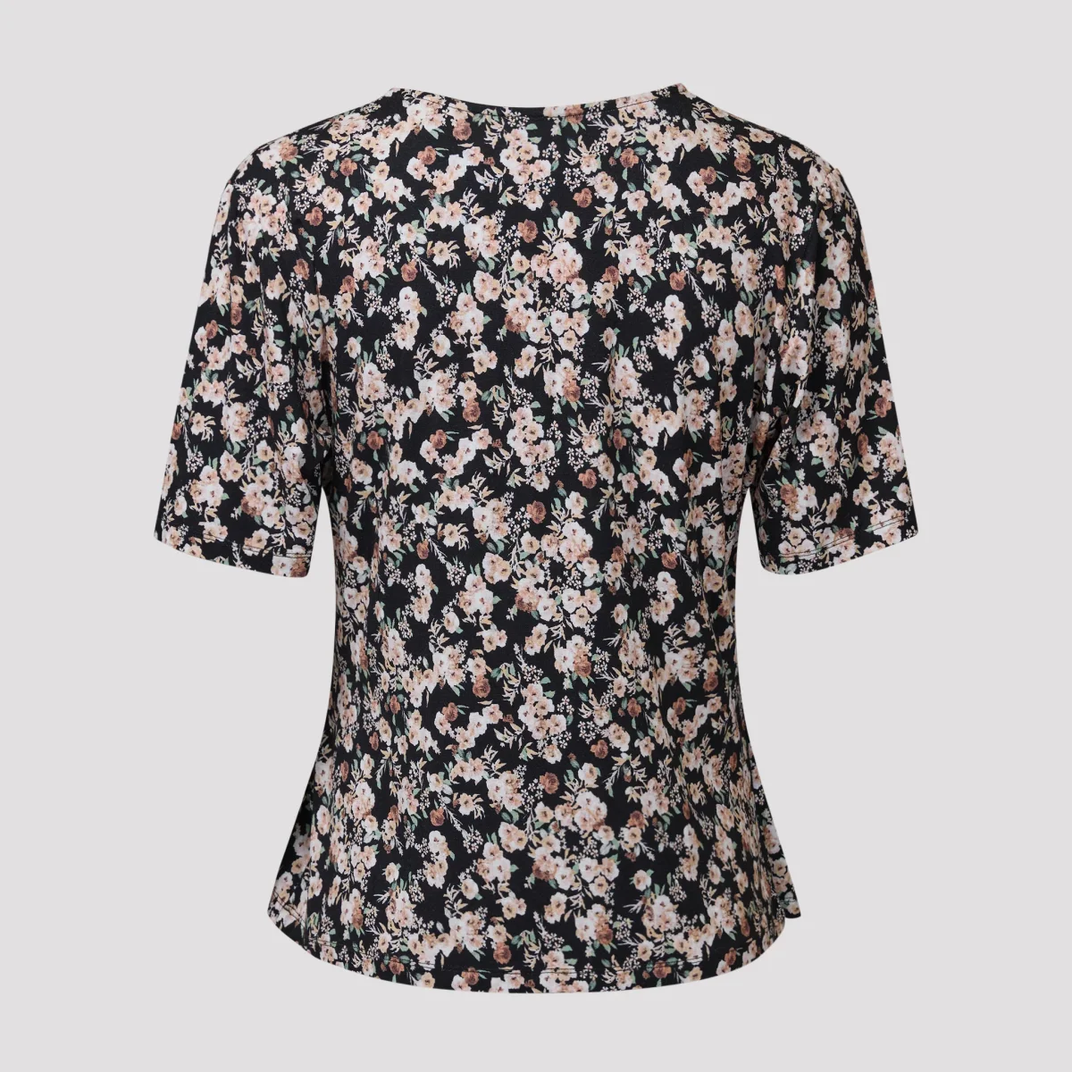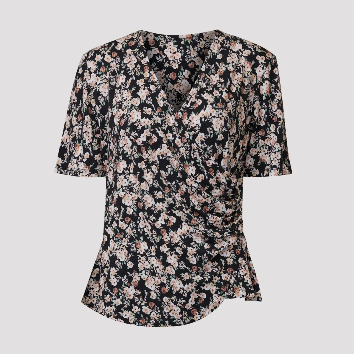 Skön V-ringad topp med svart bottenfärg och beige blommor. Draperad topp med omlott och veck på sidan som gör att den inte känns så avslöjande även om den är nätt i passformen. Trikåtopp med ärm ner till armbågen. Vår modell Yvonne är 170 cm och har storlek M på sig.