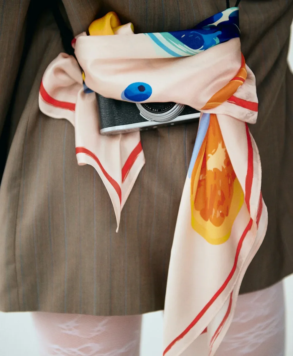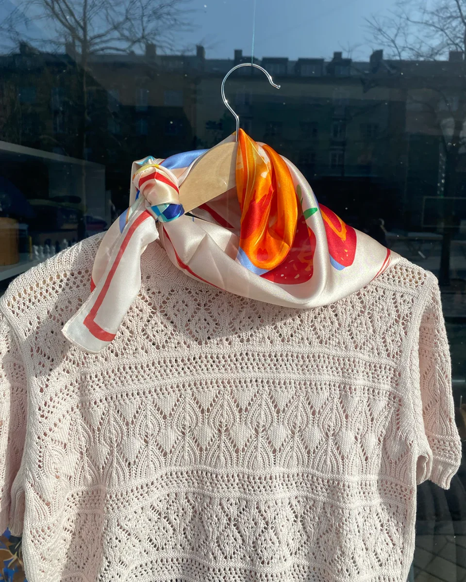 Fyrkantig sidenscarf från Sneaky Fox med crossiant, banan, blåbär, jordgubbar och apelsin. Scarfen är gjord av 100% mjukt siden och mäter 68x68cm. Designad för att användas på många olika sätt, lindad en eller två gånger runt halsen, bärs runt midjan, runt huvudet, eller som en håraccessoar.