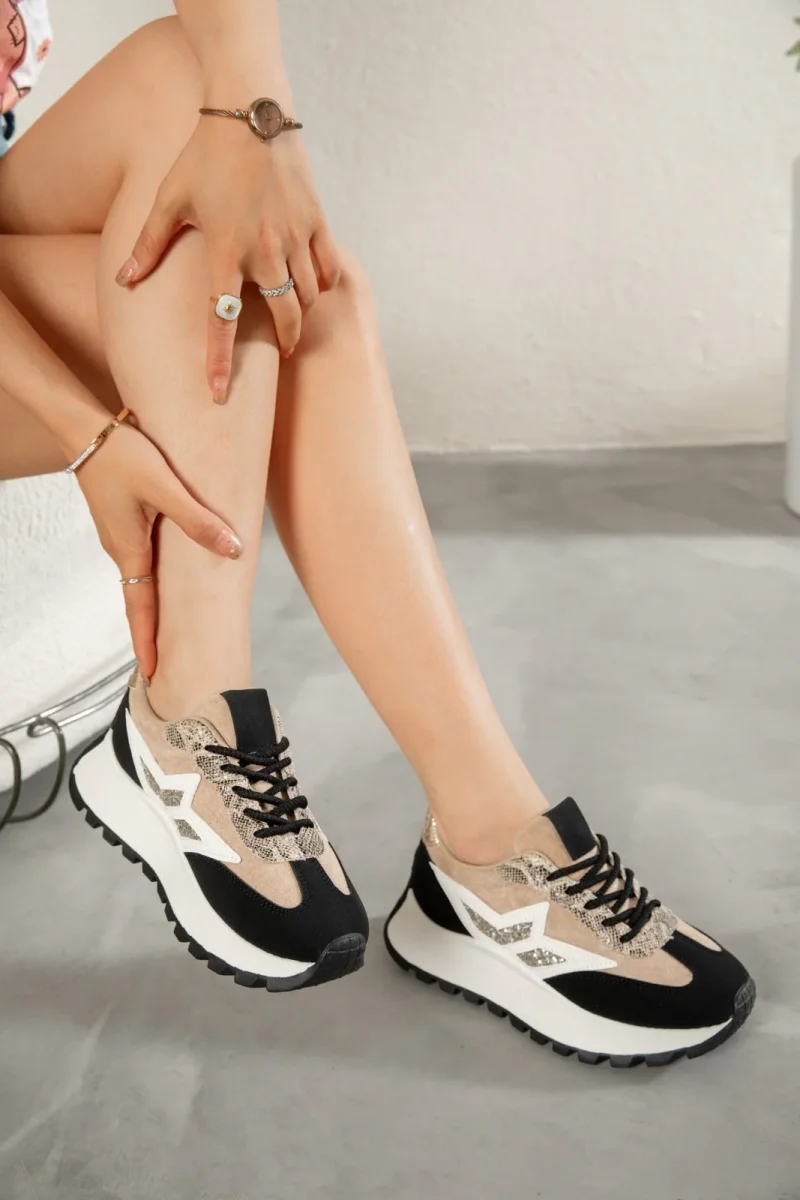 Designen blandar olika material och texturer för ett levande uttryck – från mjuka partier i mockaimitation till detaljer med lätt struktur och diskret glans. De kontrasterande inslagen och den kraftigare, mönstrade sulan ger en trendig och urban känsla.