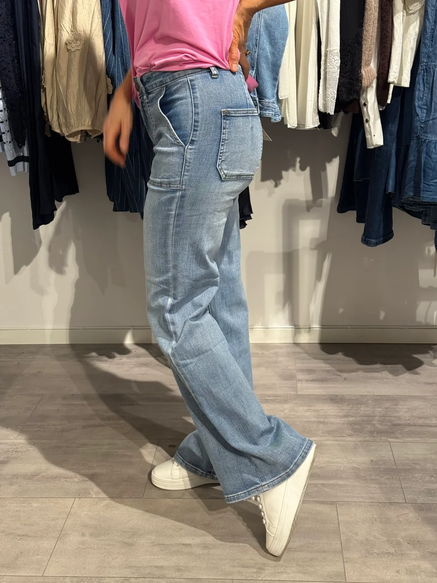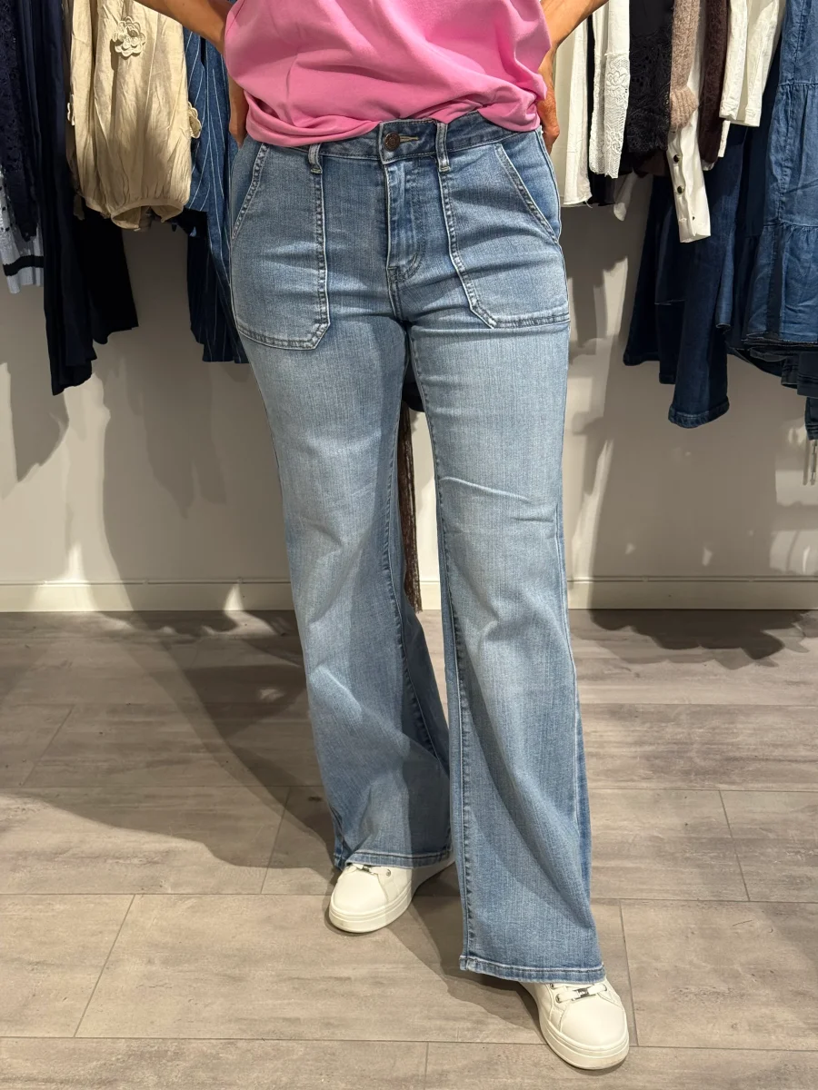 Ett par raka vida jeans med stora påsydda fickor framtill!