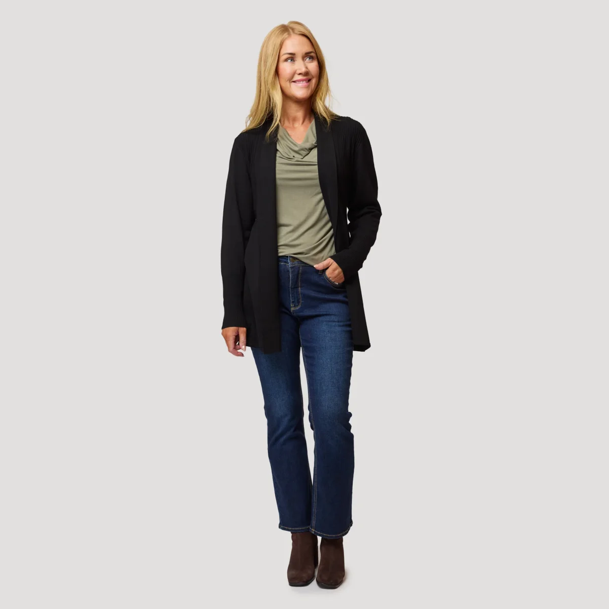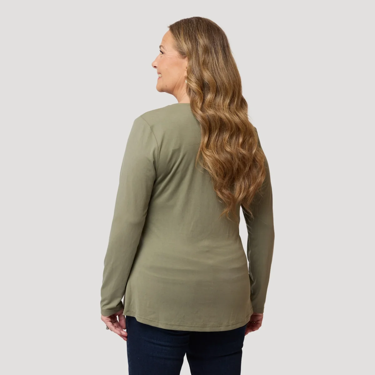 Grön draperad topp med lång ärm. Snygg användbar topp både till fest och till vardags. Trikåtopp med vattenfalls urringning som ger plagget en mer flexibel passform, ifall du vill bära den mer kroppsnära så kan du ta en storlek mindre än du brukar välja. Vår modell Yvonne är 170 cm och har storlek M på sig.