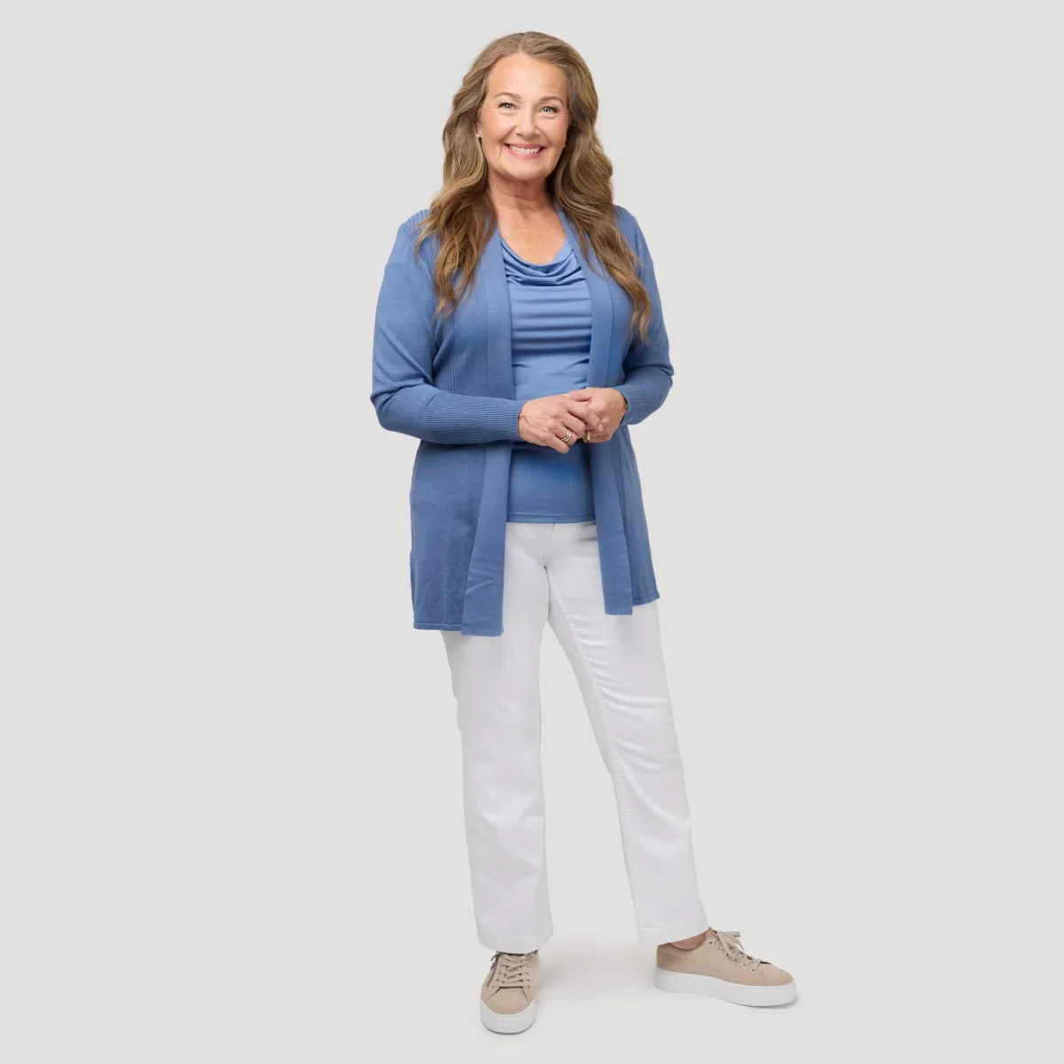 Blå, draperad topp med kort ärm. Snygg användbar topp både till fest och till vardags. Trikåtopp med vattenfalls urringning som ger plagget en mer flexibel passform, ifall du vill bära den mer kroppsnära så kan du ta en storlek mindre än du brukar välja. Vår modell Marianne är 173 cm och har storlek S på sig.
