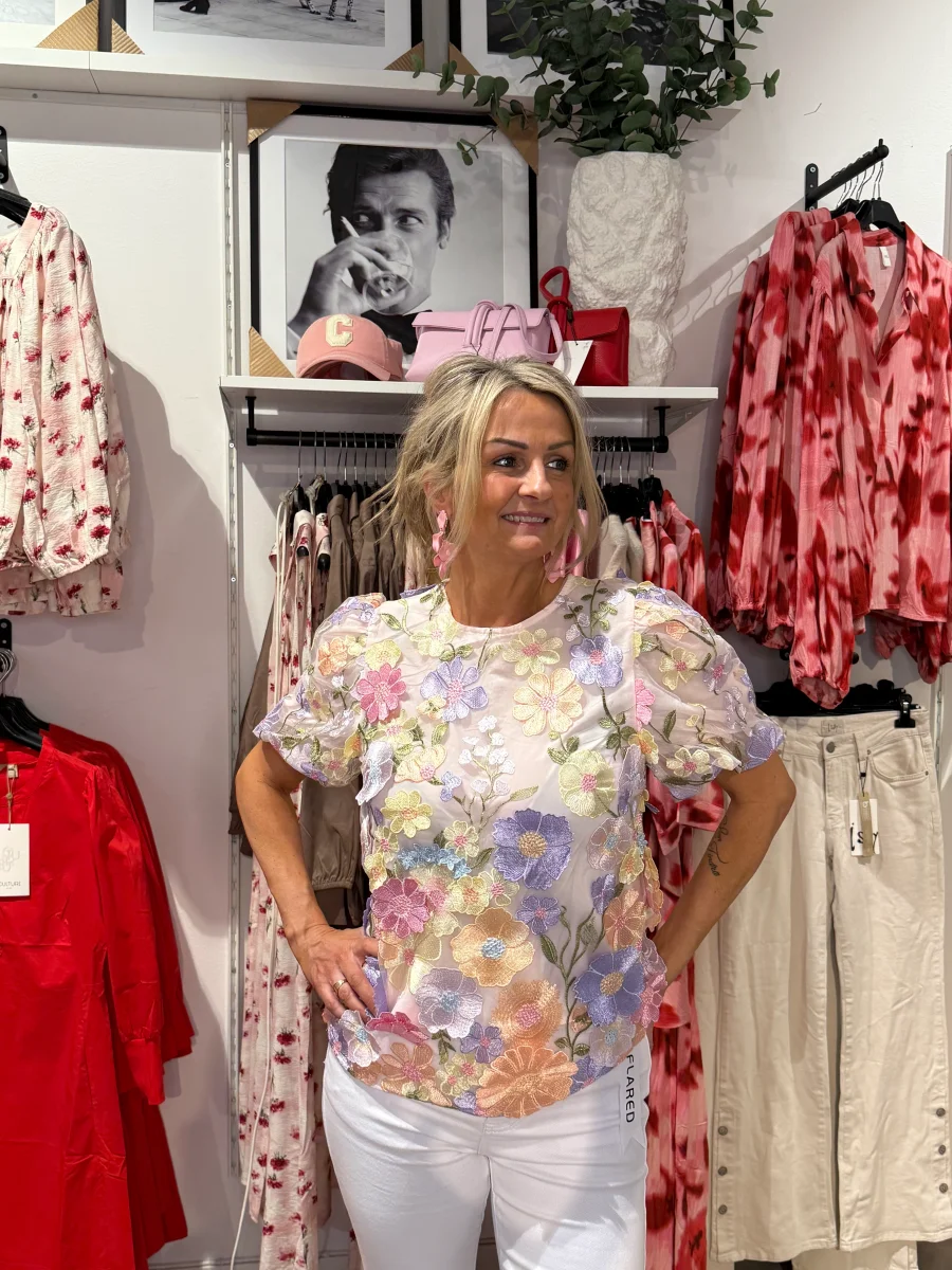 pådydda blommor i fina färger! Rak i modellen med puffärm!