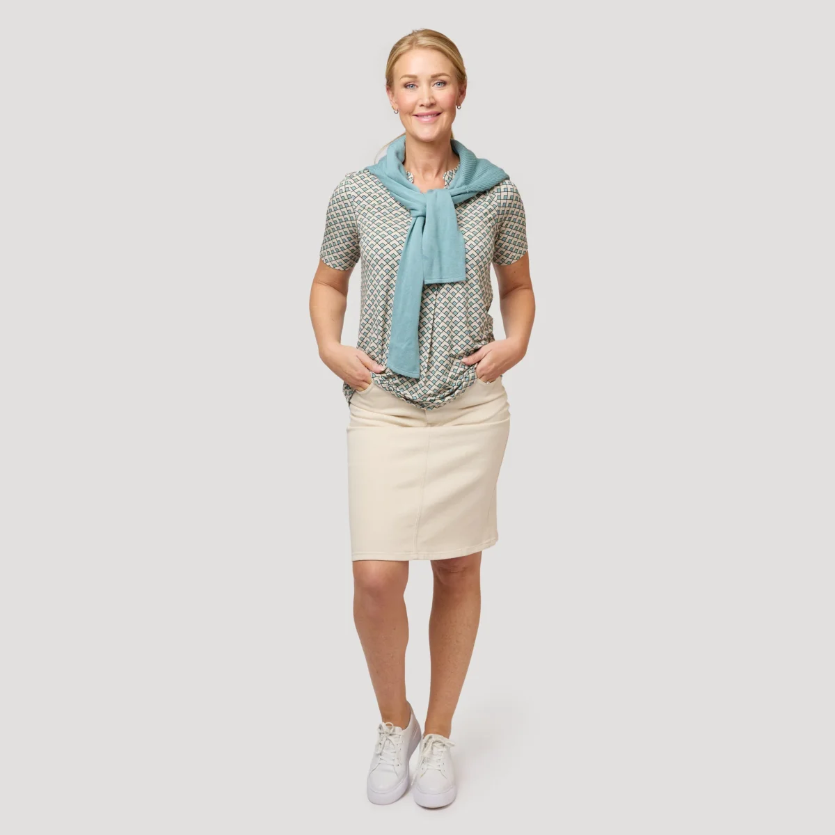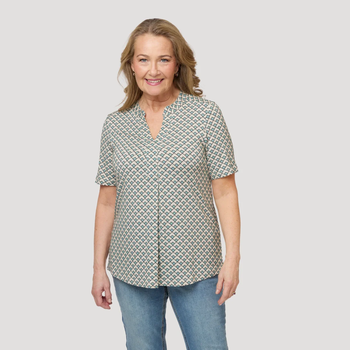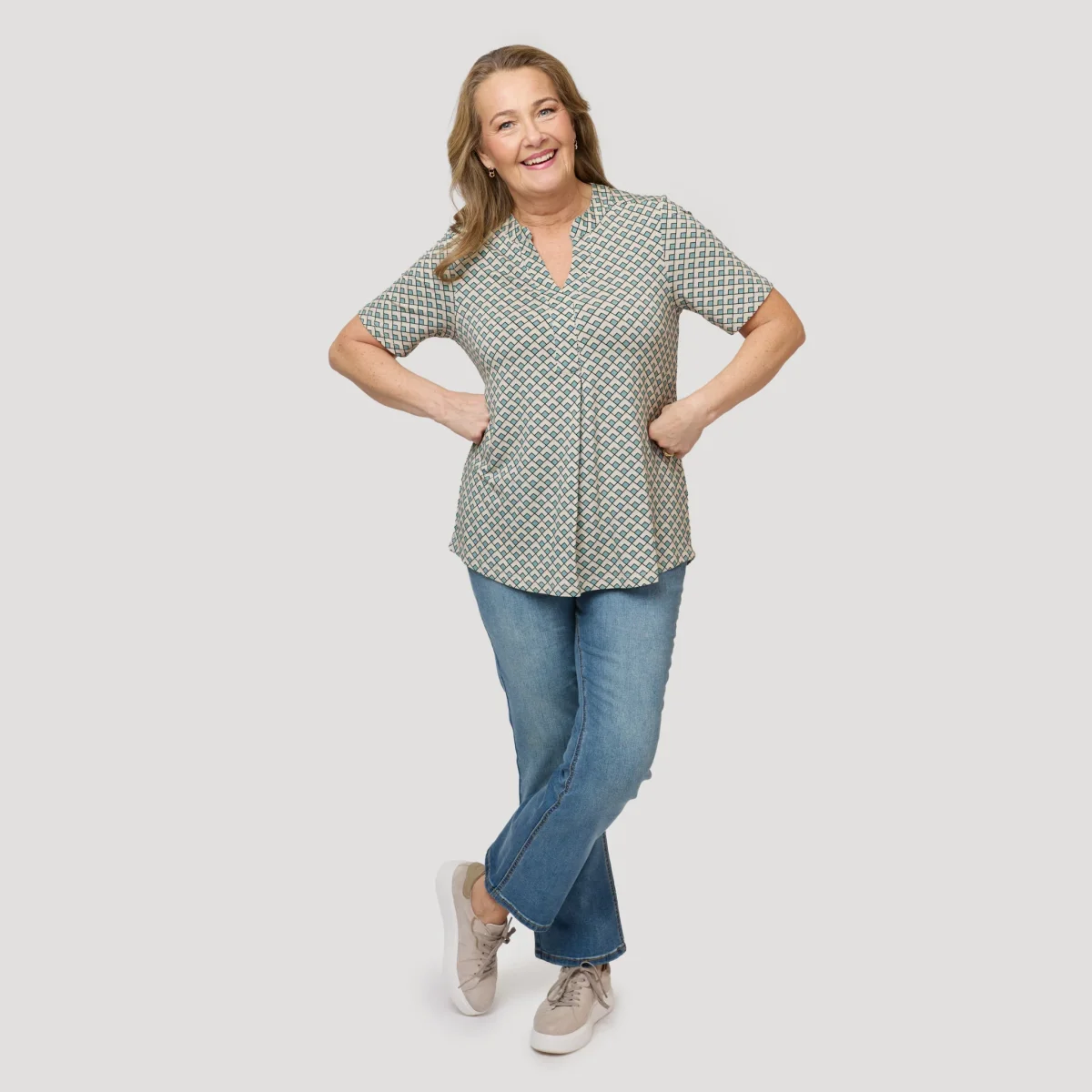 Skön topp i viskos med en key-hole urringning och ett veck framtill som ger en smickrande passform. Den kortärmade trikåtoppen har ett grafiskt mönster i beige, svart och turkos. Den mjuka toppen är rundad nertill och något längre baktill. Vår modell Yvonne är 170 cm och har storlek M på sig.
